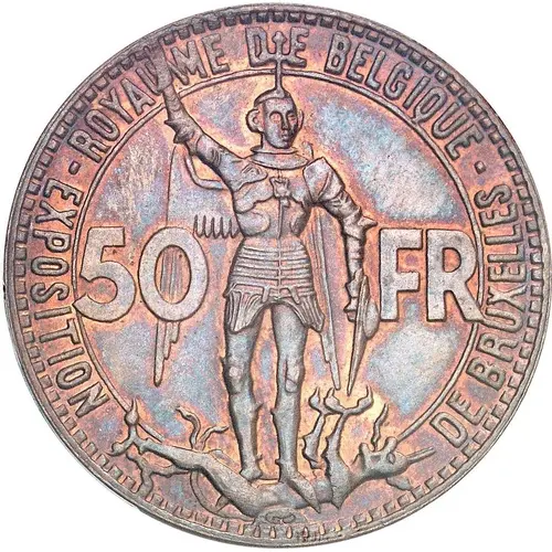 | Obverse lettering | ROYAUME DE BELGIQUE EXPOSITION DE BRUXELLES 50 FR (Translation: Kingdom of Belgium Exposition of Brussels) |