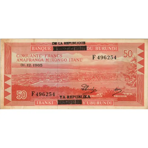 Obverse lettering BANQUE DE LA REPUBLIQUE DU BURUNDI CINQUANTE FRANCS AMAFRANGA MIRONGO ITANU IBANKI YA REPUBLIKA Y`UBURUNDI LE VICE-PRESIDENT LE PRESIDENT 1.5.1965 50