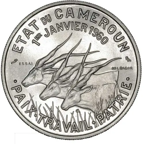 ETAT DU CAMEROUN 1er JANVIER 1960 G.B.L. BAZOR PAIX • TRAVAIL • PATRIE (Translation: State of Cameroon. January 1st, 1960. Peace, work, fatherland.) |