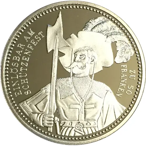 | Надписи аверса | EINLÖSBAR AM SCHÜTZENFEST ZU 50 FRANKEN |