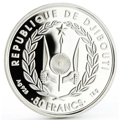| Obverse lettering | REPUBLIQUE DE DJIBOUTI Ag 925 50 FRANCS 12 G |