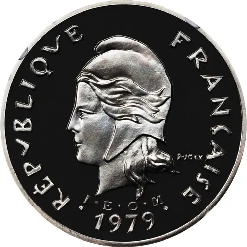 RÉPUBLIQUE FRANÇAISE R·JOLY I·E·O·M 1979 (Translation: French Republic Overseas Issuing Institute) |