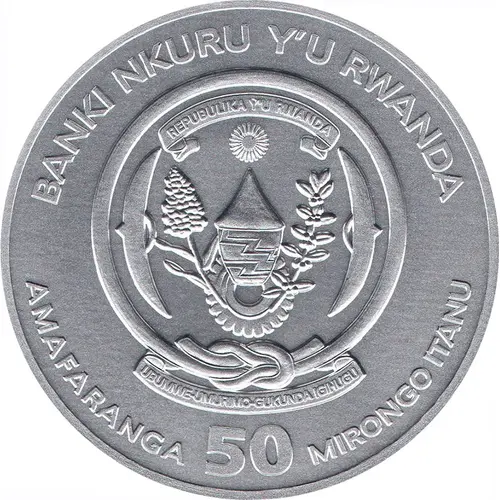 BANKI NKURU Y`U RWANDA REPUBLIKA Y`U RWANDA UBUMWE-UMURIMO-GUKUNDA-IGIHUGU AMAFARANGA 50 MIRONGO ITANU (Translation: Central Bank of Rwanda. Republic of Rwanda. Unity, work, patriotism. Fifty francs.) |