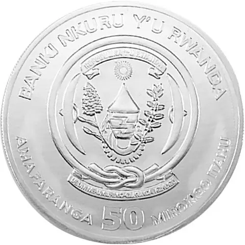 BANKI NKURU Y`U RWANDA REPUBLIKA Y`U RWANDA UBUMWI - UMURIMO - GUKUNDA IGIHUGU AMAFARANGA 50 MIRONGO ITANU (Translation: Central Bank of Rwanda Republic of Rwanda Unity, work, patriotism. Fifty francs) |