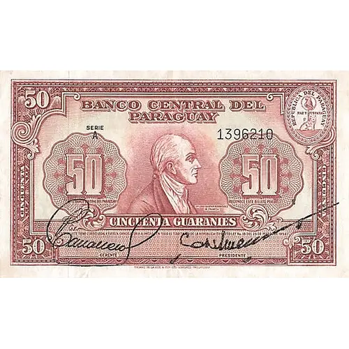 | Obverse lettering | BANCO CENTRAL DEL PARAGUAY 50 EL BANCO CENTRAL DEL PARAGUAY RECONOCE ESTE BILLETE POR CINCUENTA GUARANIES ESTE BILLETE TIENE CURSO LEGAL Y FUERZA CANCELATORIA ILIMITADA EN TODO EL TERRITORIO DE LA REPUBLICA (DECRETO LEY N. 18 DEL 25 DE MARZO DE 1952). (Translation: Central Bank of Paraguay The Central Bank of Paraguay recognizes this banknote for Fifty Guaranies This banknote has legal course and unlimited cancellation force throughout the territory of the Republic (Decree-Law # 18 of March 25th., 1952).) |