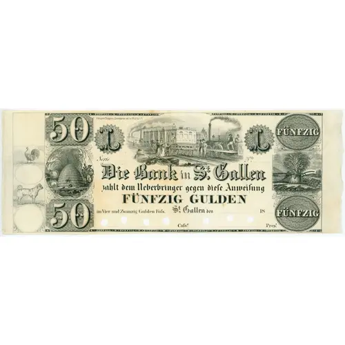 | Obverse lettering | 50 FÜNFZIG Draper. Toppan, Longacre & Co. Philᵃ. & NY L Serie _ Nᵒ. _ Die Bank in Sᵗ. Gallen zahlt dem Ueberbringer gegen dieſe Anweiſung FÜNFZIG GULDEN im Vier Zwanzig Gulden Fuſs Sᵗ. Gallen den _ 18 _ FÜNFZIG 50 Caſsʳ. Presᵗ. |