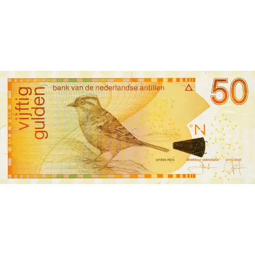 | Obverse lettering | vijftig gulden bank van de nederlandse antillen 50 andes mus (Translation: Fifty Gulden Bank of the Netherlands Antilles 50 Rufous-collared sparrow) |