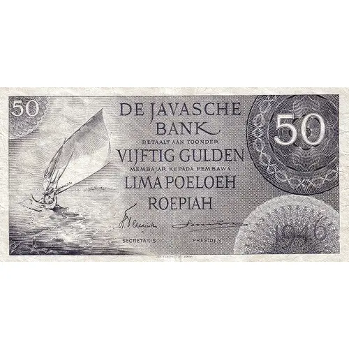 De Javasche Bank Betaalt aan Toonder Vijftig Gulden Membajar Kepada Pembawa Lima Poeloeh Roepiah (Translation: The Java Bank Will pay to the bearer Fifty Gulden Fifty Roepiah) |