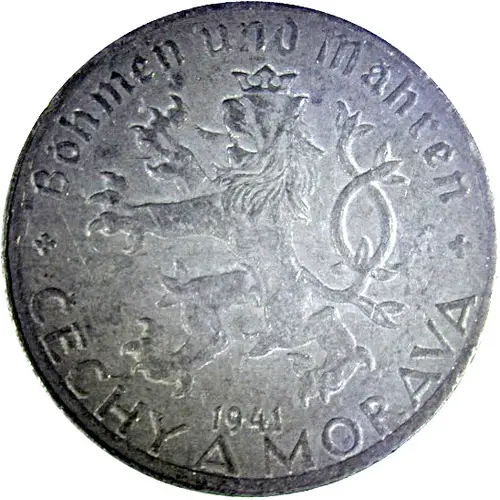 | Obverse description | In a center there is element of coat of arms of The Protectorate of Bohemia and Moravia (coat of arms of Czech): crowned lion rampant to the left, under it – year of issue. Semicircular inscriptions – in German language: BÖHMEN UND MÄHREN (above) and on Czech: ČECHY A MORAVA. |