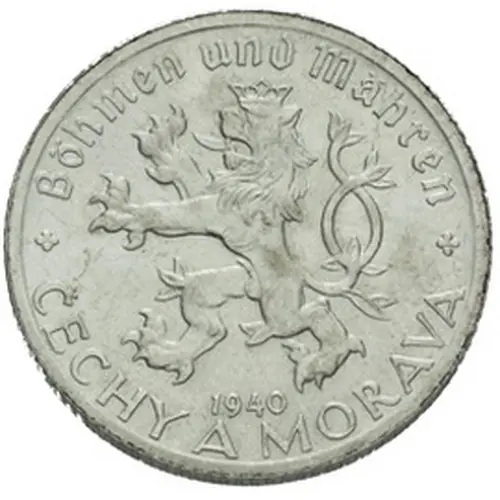 | Obverse description | In a center there is element of coat of arms of The Protectorate of Bohemia and Moravia (coat of arms of Czech): crowned lion rampant to the left, under it – year of issue. Semicircular inscriptions – in German language: BÖHMEN UND MÄHREN (above) and on Czech: ČECHY A MORAVA. |
