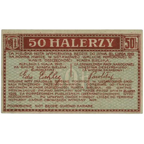 Obverse lettering 50 HALERZY Ta miejska nota wymienioną bęndzie do dnia 31. Lipca 1919 na równą kwotę w ustawowej walucie Koronowej w Kasie Oszczędności Miasta Bielska. Bielsko, I Maja 1919, za gminę Miasta Bielska Burmistrz: Za zezwoleniem Rady Narodowej Księstwa Cieszyńskiego. za wydział skarbowy: