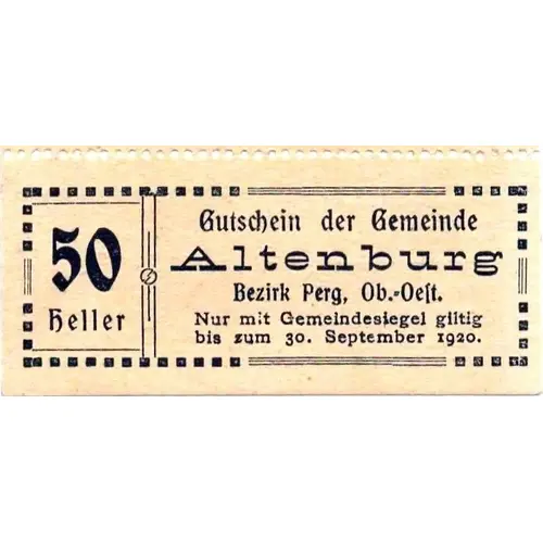 50 heller Altenburg község utalványa Perg járás, Felső-Ausztria Csak községi pecséttel érvényes 1920. szeptember 30-ig 50 heller Gutschein der Gemeinde Altenburg Bezirk Perg, Ob.-Oest. Nur mit Gemeindesiegel gültig bis zum 30. September 1920. |