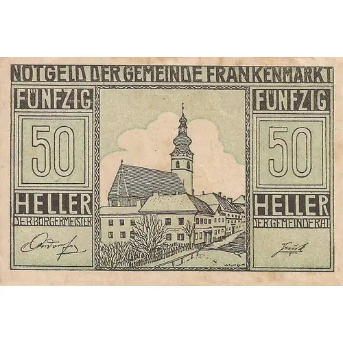 Lettering (regular font): NOTGELD DER GEMEINDE FRANKENMARKT FÜNFZIG 50 HELLER FÜNFZIG 50 HELLER DER BURGERMEISTER DER GEMEINDERAL |