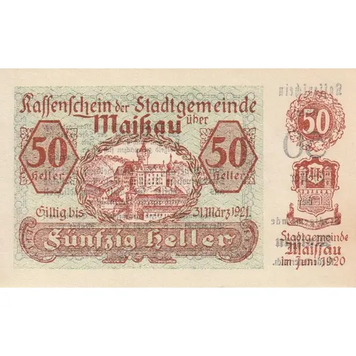 Reverse lettering Kassenschein über 50 Heller der Stadtgemeinde Maissau Niederöstereich