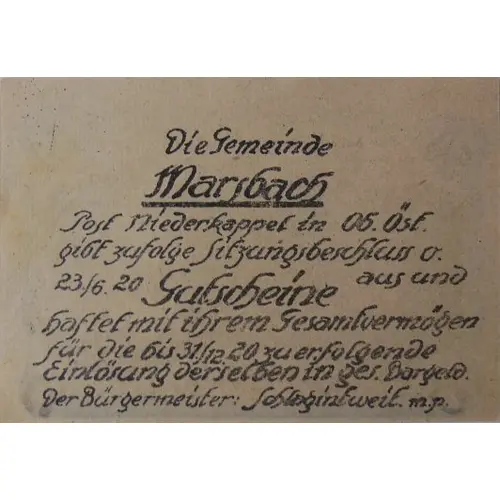 Die Gemeinde Marsbach Post Niederkappel in Ob. Öst. gibt zufolge Sitzungsbeschluss v. 23. /6./20 Gutscheine aus und haftet mit ihrem Gesamtvermögen für die bis 31./12. 20 zu erfolgende Einlösung derselben in ges. Bargeld. der Bürgermeister: (Translation: The municipality Marsbach Post Niederkappel in Upper Austria issues vouchers according to the decision of the meeting and is liable with its total assets for the redemption of the same in healthy cash to be made until 31th of December 1920. The mayor:) |