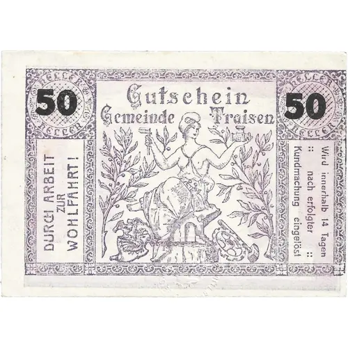 | Obverse lettering | Gutschein Gemeinde Traisen DURCH ARBEIT ZUR WOHLFAHRT! Wird innerhalb 14 Tagen nach erfolgter Kundmachung eingelöst (Translation: Voucher Community of Traisen THROUGH WORK TO WELFARE! Will be issued within 14 days after the announcement) |
