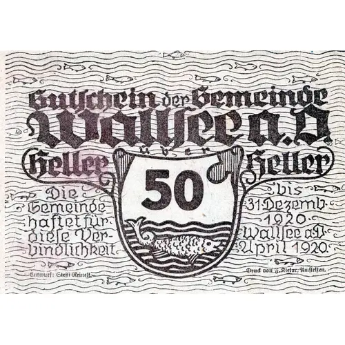 | Obverse lettering | Gutschein der Gemeinde Wallsee a.D. heller 50 heller Die Gemeinde haftet für die Vervindlichreit bis 31. Dezemb 1920. Wallsee a.D. April 1920. Entwurt: Gtefft Renelz Deud von F. Aietor, Amftetten |