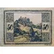 Ligh black printing, picture of a country side with a caslte on a hill in the distance. A 50 on either side of the picture, decorative artwork around the picture and 50s |