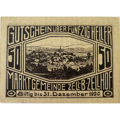 | Obverse lettering | GUTSCHEIN ÜBER FÜNFZIG HELLER 50 50 MARKT GEMEINDE ZELL-B-ZELLHOF GILTIG BIS 31.DEZEMBER 1920 |