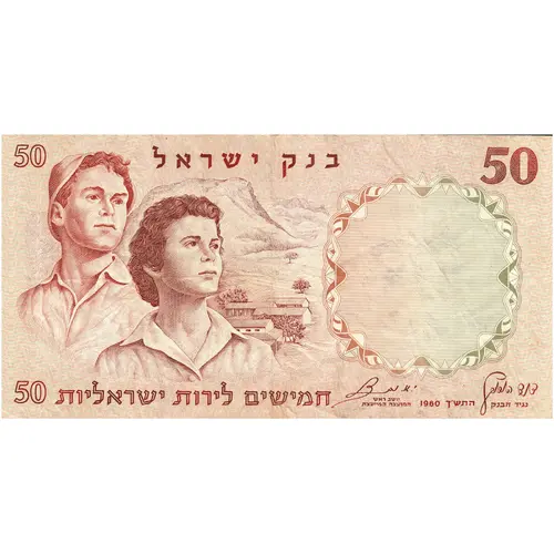 | Obverse description | Two young Israeli pioneers against a background of an agricultural settlement in the Negev; the denomination `Fifty Israeli Pounds` and `Bank of Israel` in Hebrew. |