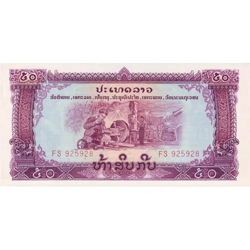 Lao text; farmers plowing rice paddy with water buffalos; Wat That Luang stupa in Vientiane. |