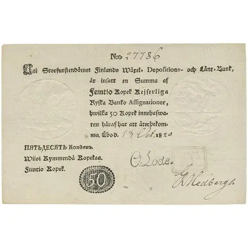 | Obverse lettering | Uti Storfurstemdömet Finlands wäxel-depositions och låne-bank är insatt en summa av femtio kopeck kejserliga ryska banko-assignationer, hvilka 50 kopek innehafveren häraf har att återbekomma. Åbo. Wiisi Kymmentä kopekaa (Translation: In the Grand Principality of Finland`s Exchange-Deposit and Loan Bank are held the sum of fifty kopecks Imperial Russian Bank Assignats, of which the holder has 50 kopeck to receive. Turku. Fifty Kopeks) |