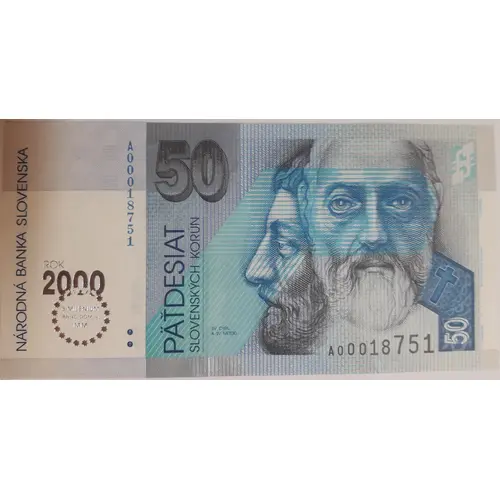 50 NÁRODNÁ BANKA SLOVENSKA ROK 2000 BIMILÉNIUM ANNO DOMINI MM PÄŤDESIAT SLOVENSKÝCH KORÚN SV. CYRIL A SV. METOD R.BECKERS SC. NÁRODNÁ BANKA SLOVENSKA J.BUBÁK DEL. |