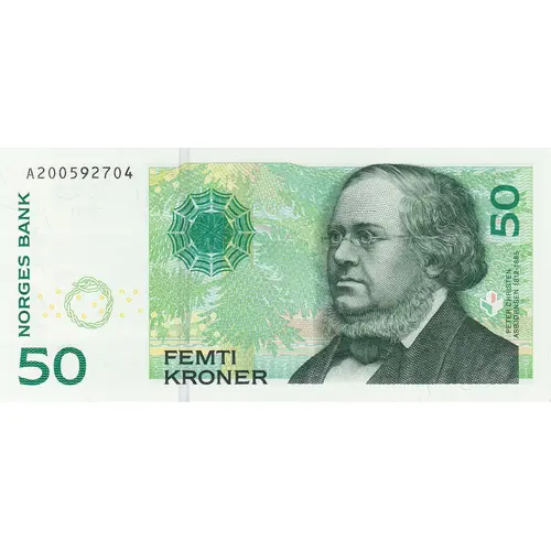 | Obverse lettering | NORGES BANK FEMTI KRONER PETER CHRISTEN ASBJØRNSEN 1812 - 1885 (Translation: Bank of Norway Fifty Kroner Peter Christen Asbjørnsen 1812-1885) |