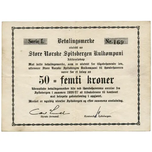 Betalingsmerke utstedt av Store Norske Spitsbergen Kulkompani Aktieselskap Mot dette betalingsmerke, som er utstedt for tilgodehavende løn, utleverer Store Norske Spitsbergen Kulkompani til ihændehaveren varer for et beløp av 50 = femti kroner Ubenyttede betalingsmerker blir ved ihændehaverens avreise fra Spitsbergen i sæsonen 1926/27 at tilbakelevere til kontoret mot beløpets godskrivning i opgjøret. Merket er ugyldig utenfor Spitsbergen og efter sæsonens avslutning. Styrets formand. Kontorchef, Spitsbergen. (Translation: Payment note issued by The Great Norwegian Spitsbergen Coal Company Against this payment note, which is issued for outstanding wages, The Great Norwegian Spitsbergen Coal Company delivers to the bearer goods for an amount of 50 kroner Unused notes when the beares departs from Spitsbergen during the season 1924/25 is returned to the office against credit of the amount in the settlement. The note is invalid outside Spitsbergen and after the end of the season. Chairman of the board. Office manager, Spitsbergen.) |