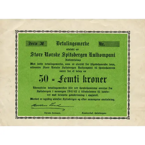 Betalingsmerke utstedt av Store Norske Spitsbergen Kulkompani Aktieselskap Mot dette betalingsmerke, som er utstedt for tilgodehavende lønn, utleverer Store Norske Spitsbergen Kulkompani til ihændehaveren varer for et beløp av 50 = femti kroner Ubenyttede betalingsmerker blir ved ihændehaverens avreise fra Spitsbergen i sæsonen 1941/42 at tilbakelevere til konto= ret mot beløpets godskrivning i opgjøret. Merket er ugyldig utenfor Spitsbergen og efter sæsonens avslutning. Styrets formann. Kontorchef, Spitsbergen. (Translation: Payment note issued by The Great Norwegian Spitsbergen Coal Company Against this payment note, which is issued for outstanding wages, The Great Norwegian Spitsbergen Coal Company delivers to the bearer goods for an amount of 50 kroner Unused notes when the beares departs from Spitsbergen during the season 1924/25 is returned to the office against credit of the amount in the settlement. The note is invalid outside Spitsbergen and after the end of the season. Chairman of the board. Office manager, Spitsbergen.) |