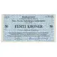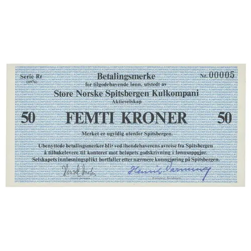 Betalingsmerke for tilgodehavende lønn, utstedt av Store Norske Spitsbergen Kulkompani Aktieselskap 50 FEMTI KRONER 50 Merket er ugyldig utenfor Spitsbergen. Ubenyttede betalingsmerker blir ved ihendehaverens avreise fra Spitsbergen å tilbakelevere til kontoret mot beløpets godskrivning i lønnsoppgjør. Selskapets innløsningsplikt bortfaller etter nærmere kunngjøring på Spitsbergen. Styrets formann. Kontorsjef, Spitsbergen. (Translation: Payment note issued by The Great Norwegian Spitsbergen Coal Company for due wages 50 kroner The note is invalid outside Spitsbergen. Unused payment notes must be returned upon the holder`s departure from Spitsbergen to the office againt the amount being credited on the payroll. The company`s obligation ceases after further announcement on Spitsbergen. Chairman of the board. Office manager, Spitsbergen.) |