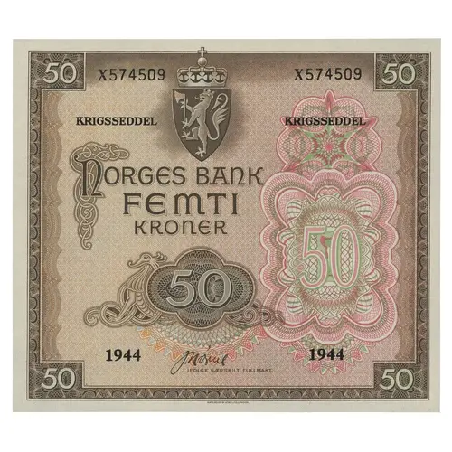 KRIGSSEDDEL KRIGSSEDDEL NORGES BANK FEMTI KRONER 50 50 1944 1944 IFÖLGE SÆRSKILT FULLMAKT WATERLOW & SONS LIMITED, LONDON |