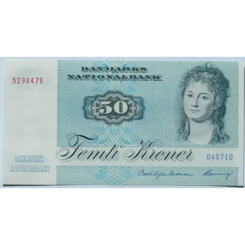 | Opschrift voorzijde | Number DANMARKS NATIONALBANK 50 FEMTI KRONER serial# DANMARKS NATIONALBANK 2 signatures (Translation: Nationalbank of Denmark Fifty Kroner Nationalbank of Denmark) |
