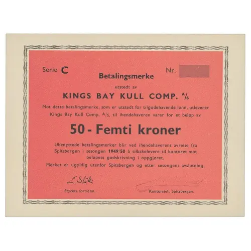 Betalingsmerke utstedt av KINGS BAY KULL COMP. A/S Mot dette betalingsmerke, som er utstedt for tilgodehavende lønn, utleverer Kings Bay Kull Comp. A/S, til ihendehaveren varer for et beløp av 50 - Femti kroner Ubenyttede betalingsmerker til ved ihendehaverens avreise fra Spitsbergen i sesongen 1949/50 å tilbakelevere til kontoret mot beløpets godskrivning i oppgjøret. Merket er ugyldig utenfor Spitsbergen og etter sesongens avslutning. Styrets formann. Kontorsjef, Spitsbergen (Translation: Payment note issued by Kings Bay Coal Company Against this payment note, which is issued for outstanding wages, The Great Norwegian Spitsbergen Coal Company delivers to the bearer goods for an amount of 50 kroner Unused notes when the beares departs from Spitsbergen during the season 1949/50 is returned to the office against credit of the amount in the settlement. The note is invalid outside Spitsbergen and after the end of the season. Chairman of the board. Office manager, Spitsbergen.) |