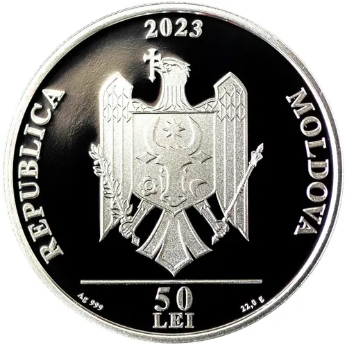 In the foreground – the State Coat of Arms of the Republic of Moldova; at the top - the year of issue `2023`; - at the bottom – three inscriptions: `Ag 999`, `50 LEI` and `22,0 g` in exergue; - also in exergue - the inscription `REPUBLICA MOLDOVA` is engraved in capital letters. |