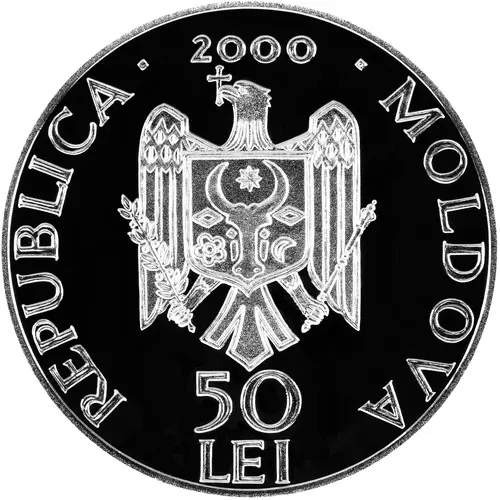 - on the central part – the Coat of Arms of the Republic of Moldova; - on the upper part - figure `2000`; - on the bottom part -the inscription `50 LEI`; - following the coin circumference– the inscription `REPUBLICA MOLDOVA` is engraved in block letters. |