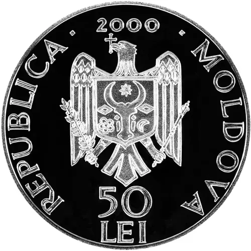 正面描述 - on the central part – the Coat of Arms of the Republic of Moldova; - on the upper part - figure `2000`; - on the bottom part -the inscription `50 LEI`; - following the coin circumference– the inscription `REPUBLICA MOLDOVA` is engraved in block letters.