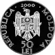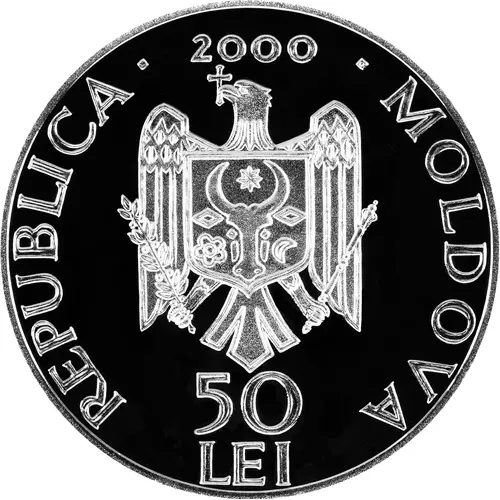 Ön yüz açıklaması - on the central part – the Coat of Arms of the Republic of Moldova; - on the upper part - figure `2000`; - on the bottom part -the inscription `50 LEI`; - following the coin circumference– the inscription `REPUBLICA MOLDOVA` is engraved in block letters.