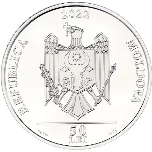 - in the foreground – the State Coat of Arms of the Republic of Moldova; - at the top - the year of issue „2022”; - at the bottom - three inscriptions: „Ag 999”, „50 LEI” and „22.0 g”; - in exergue - the inscription `REPUBLICA MOLDOVA` in capital letters. |