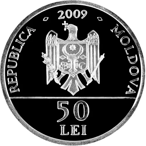 On the central part – the Coat of Arms of the Republic of Moldova; on the upper part - figure `2009`; on the bottom part -the inscription `50 LEI`; following the coin circumference– the inscription `REPUBLICA MOLDOVA` is engraved in block letters. |