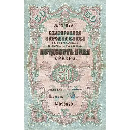 (Translation: Fifty Leva Silver The Bulgarian National Bank Pays the Bearer for exchange of this banknote)