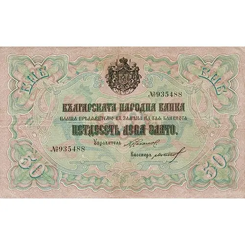 | نوشتههای روی اسکناس | Петдесетъ Лева Злато Българската Народна Банка Плаща Прѣдѫвителю въ замѣна на таѫ банкнота (Translation: Fifty Leva Gold The Bulgarian National Bank Pays the Bearer for exchange of this banknote) |