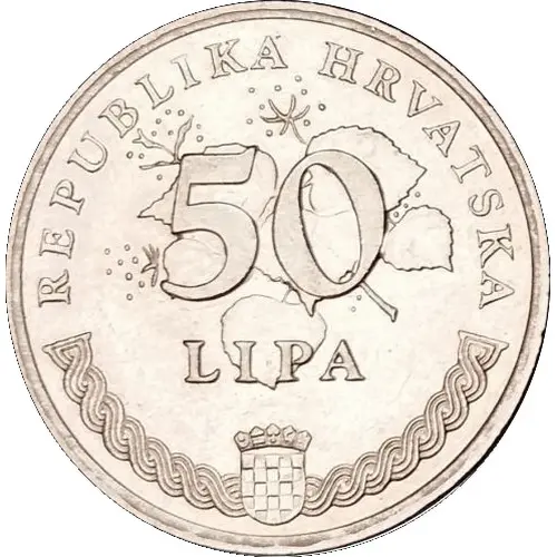 In the central part is shown stylized linden branch in inflorescence and on the leaves is written the value of the coin (50). Under the number is written inscription `LIPA` (linden). Around the top edge is written `REPUBLIKA HRVATSKA` (The Republic of Croatia). Around the lower edge, in the central part, is the coat of arms of Republic of Croatia. Left and right of the coat of arms is laid old Croatian braided ornaments. |