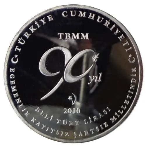 | Obverse lettering | TÜRKİYE CUMHURİYETİ TBMM 90 yıl 2010 ELLİ TÜRK LİRASI EGEMENLİK KAYIATSIZ ŞARTSIZ MILLETİNDİIR |