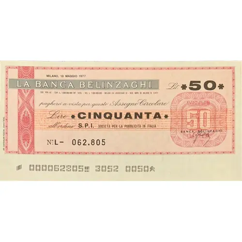 | Надписи оборотной стороны | IL PRESENTE ASSEGNO PUÒ CIRCOLARE SOLTANTO IN ITALIA GIRATE SOMMA VALE LIRE CINQUANTA |
