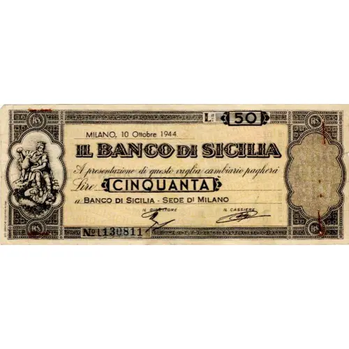 | Obverse lettering | Milano, 10 Ottobre 1944 Il Banco Di Sicilia A presentazione di questo vaglia cambiario paghera Lire Cinquanta a Banco Di Sicilia - Sede Di Milano (Translation: Milan, 10 October 1944 The Banco Di Sicilia Will pay upon presentation of this promissory note Fifty Lire at Banco Di Sicilia - Milan office) |