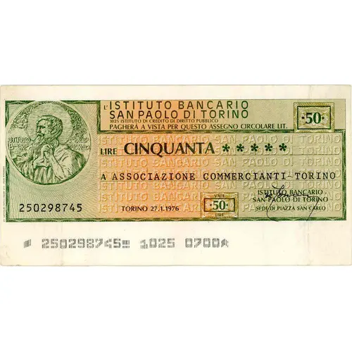 | Obverse lettering | L`ISTITUTO BANCARIO SAN PAOLO DI TORINO 1025 ISTITUTO DI CREDITO DI DIRITTO PUBBLICO PAGHERÀ A VISTA PER QUESTO ASSEGNO CIRCOLARE LIT. LIRE CINQUANTA A Torino VALE 50 LIRE ISTITUTO BANCARIO SAN PAOLO DI TORINO SEDE DI PIAZZA SAN CARLO OFF. CARTEVALORI (Translation: The Saint Paul of Turin Banking Institute (Institution) 1025 Credit Institute of Public Law will pay for this cashier`s check on sight (in) Italian Lire Fifty Lire to |