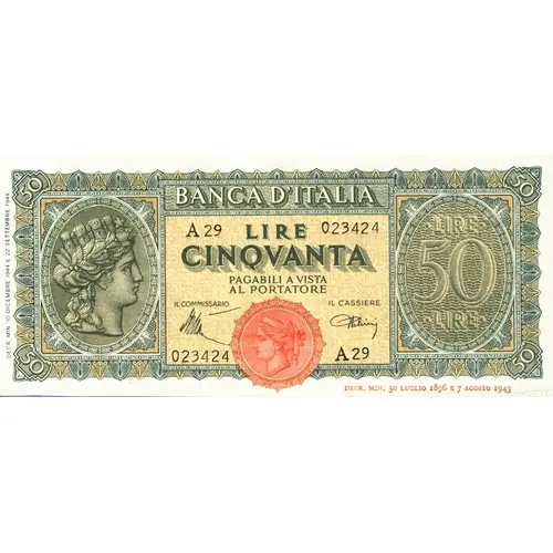 | Obverse lettering | BANCA D`ITALIA LIRE CINQUANTA |
