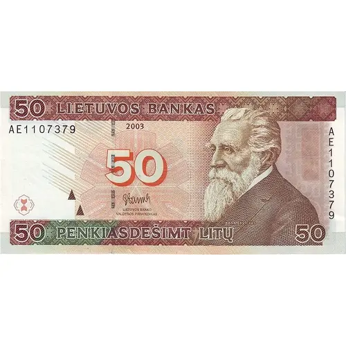 50 LIETUVOS BANKAS 2003 50 LIETUVOS BANKO VALDYBOS PIRMININKAS J. BASANAVICIUS PENKIASDEŠIMT LITŲ (Translation: Lithuanian Bank 2003 Lithuanian Bank Valdybos Pirmininkas J Basanavičius Fifty Litu) |