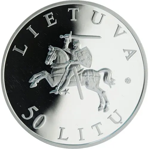 | Description de l’avers | The obverse of the coin features the Vytis, surrounded by the inscription LIETUVA (Lithuania), denomination (50 litų), and the mintmark of the Lithuanian Mint. |